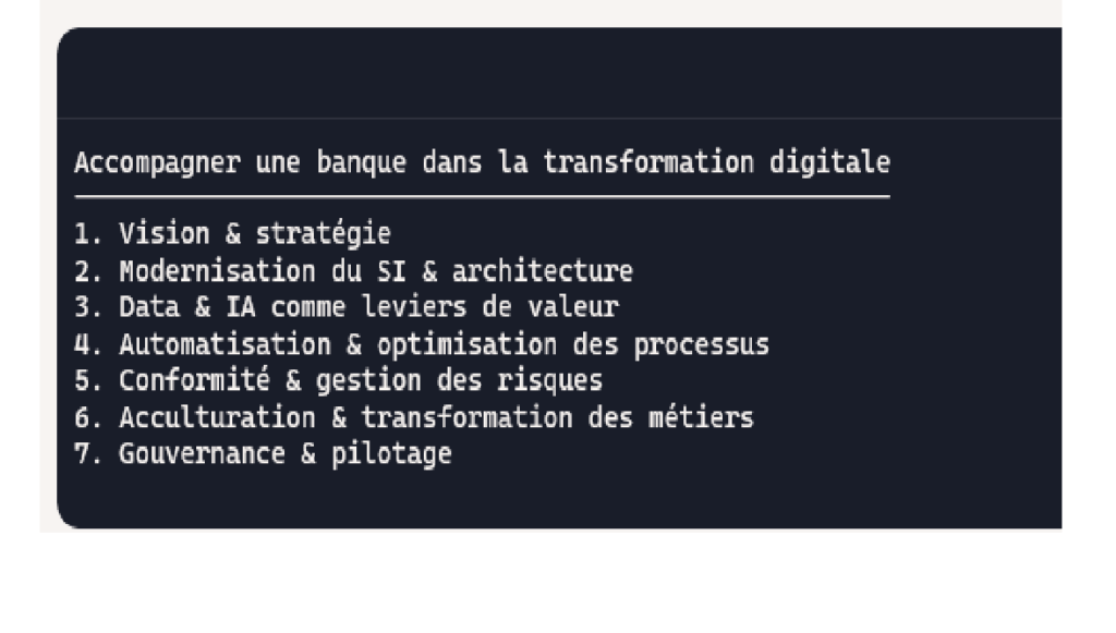 Une banque ne se transforme pas en adoptant des outils, mais en alignant stratégie, data, technologie, organisation et culture.